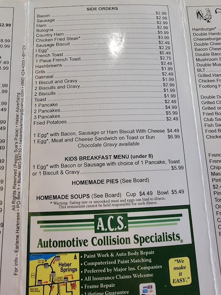 Welcome to Peggy Sue's Place, where Southern home cooking meets a warm, inviting atmosphere! Located in Heber Springs, AR, we serve breakfast all day alongside delicious daily lunch specials and homemade pies. Our family-friendly restaurant offers a cozy setting complete with outdoor seating, takeout, and delivery options. Indulge in excellent coffee, delightful desserts, and a variety of local specialties. With accessible facilities and a menu catering to vegetarians, Peggy Sue's Place is perfect for solo diners and families alike. Join us for a peaceful meal in a charming environment that feels just like home!